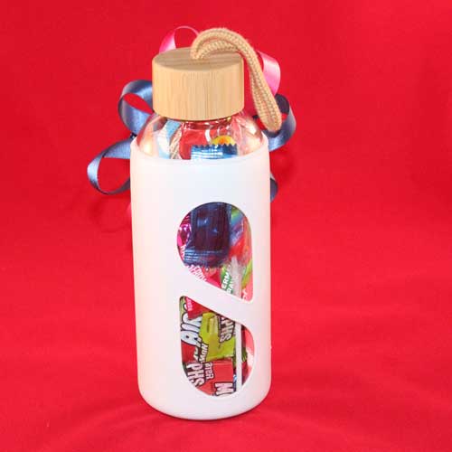 This is a glass bottle with a rubber thing around it and candy filled.